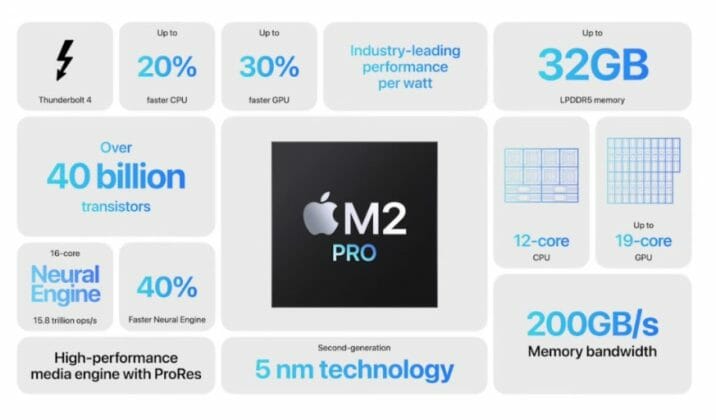 Con chip M2 Pro mới này được chế tạo bằng quy trình 5nm thế hệ thứ hai nên có nhiều bóng bán dẫn hơn 20% so với con M1 Pro, 50% so với con chip M2. Hiệu suất CPU đa luồng nhanh hơn 20% so với mẫu M1 Pro. Theo như Apple, chipset này có thể xử lý các tác vụ nặng trên các ứng dụng Photoshop và Xcode tốt hơn đáng kể. Bên cạnh đó chip còn cung cấp băng thông bộ nhớ hợp nhất (unified memory bandwidth) 200 GB/giây và bộ nhớ RAM lên tới 32GB.