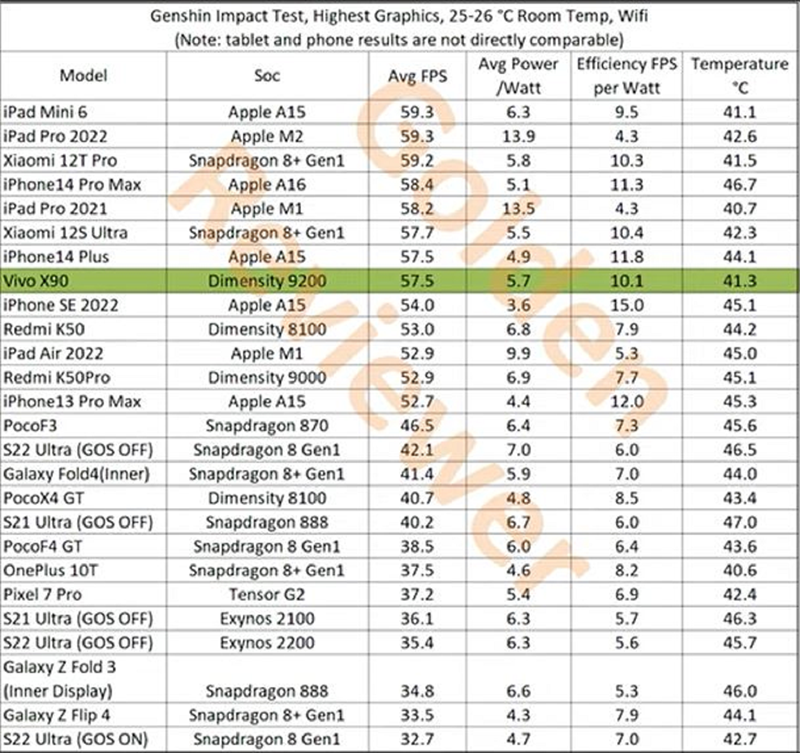 Con chip Dimensity 9200 bên trong Vivo X90 đạt mức FPS là 57.5, thua Apple A16 trên mẫu iPhone 14 Pro Max (58.4 FPS) thậm chí kém hơn chip Snapdragon 8+ Gen 1 trên Xiaomi 12T Pro khi mẫu này đạt 59.2 FPS.