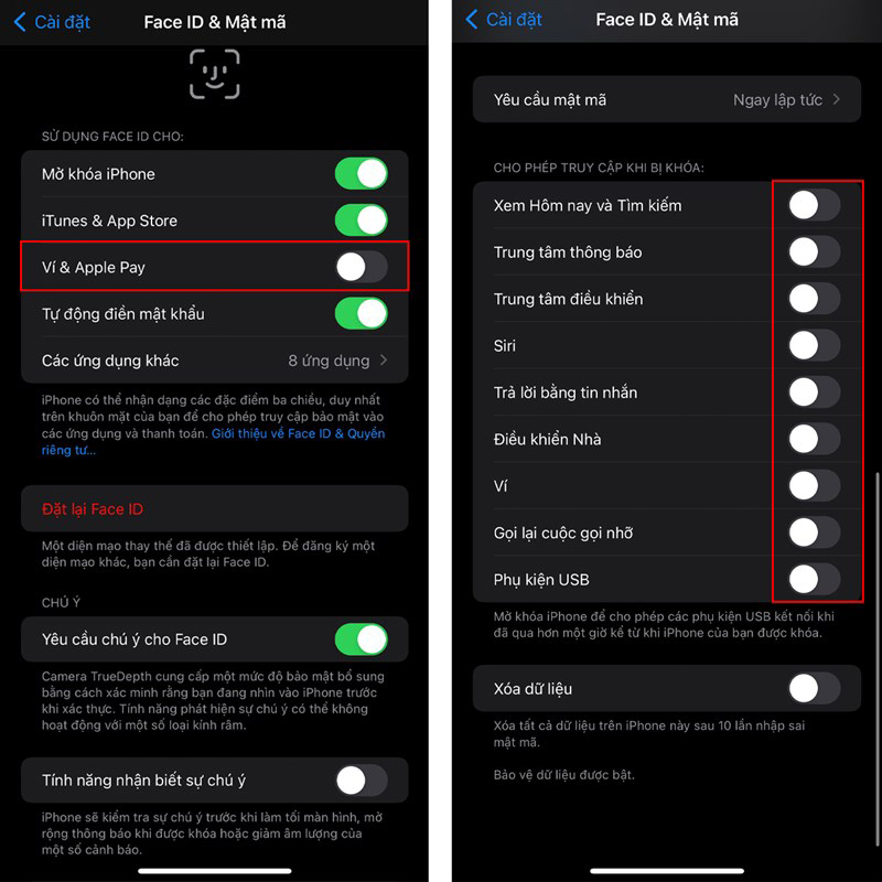 Bước 2: Sau đí tắt tính năng Ví & Apple Pay > Tắt luôn các tính năng tại mục Cho phép truy cập khi bị khóa là xong. Sau khi tắt các tính năng trên thì ví Apple của người dùng sẽ an toàn hơn rất nhiều đó.