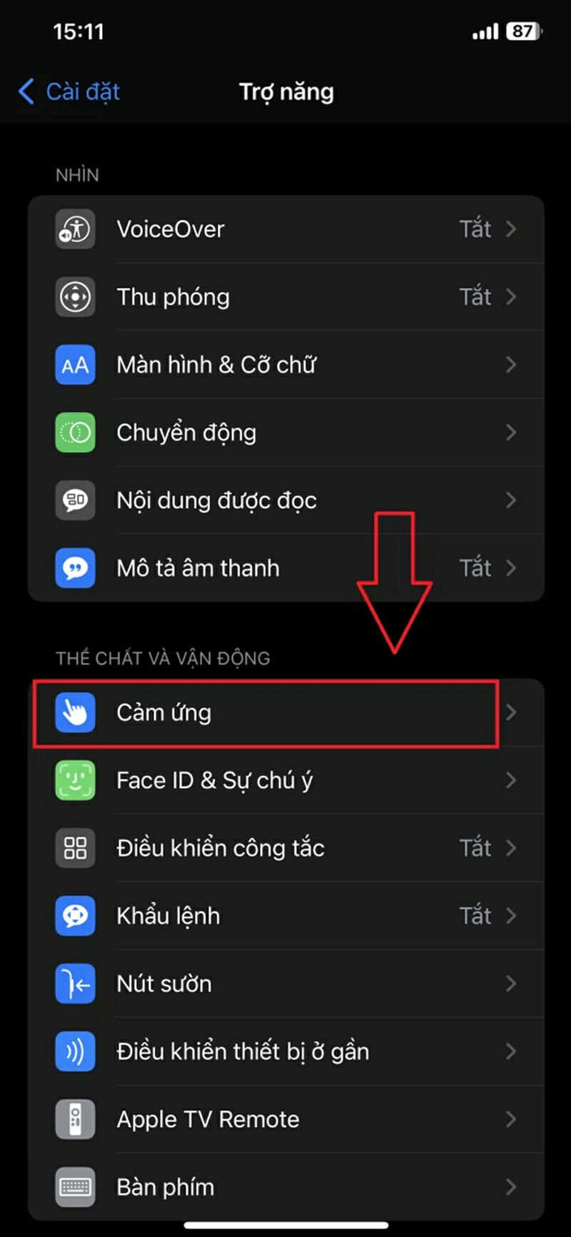 Bước 3: Chọn mục Cảm ứng nằm ngay phía bên dưới của phần THỂ CHẤT VÀ VẬN ĐỘNG.