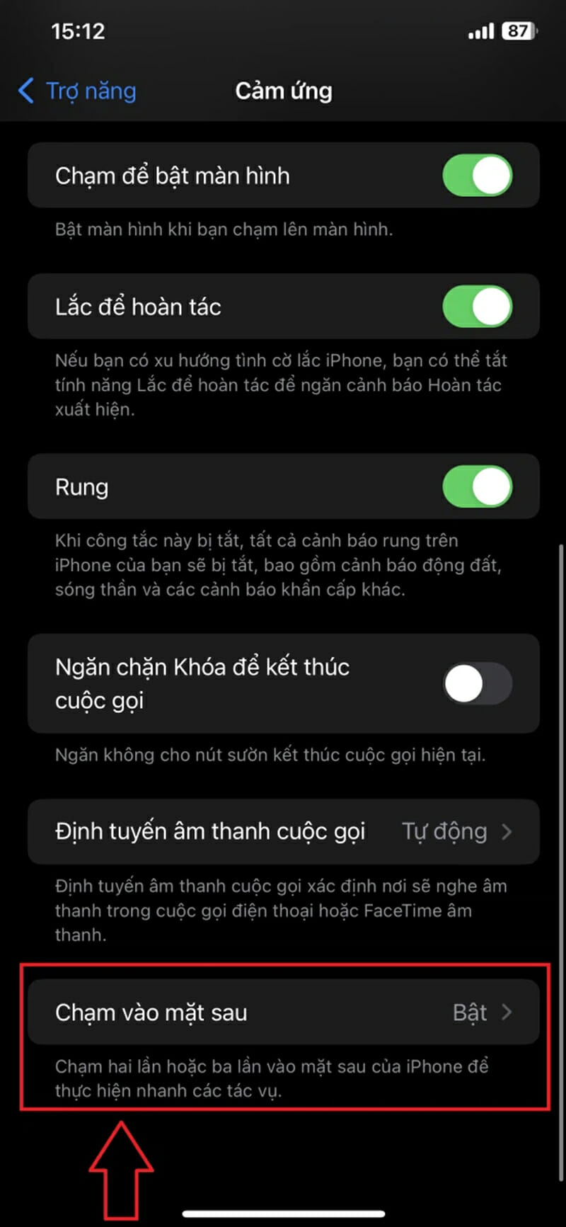 Bước 4: Ở phần dưới cùng của màn hình iPhone người dùng hãy chọn mục Chạm vào mặt sau.