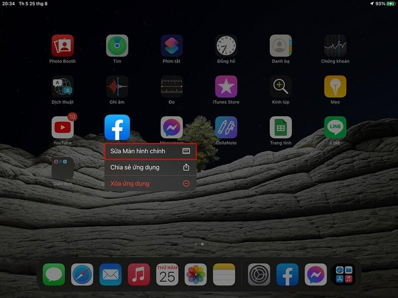Bước 1: Tại giao diện chính của chiếc iPad người dùng hãy nhấn chọn và giữ vào ứng dụng người dùng muốn thực hiện đổi ví trí > Sau đó Kích chọn Sửa màn hình chính.