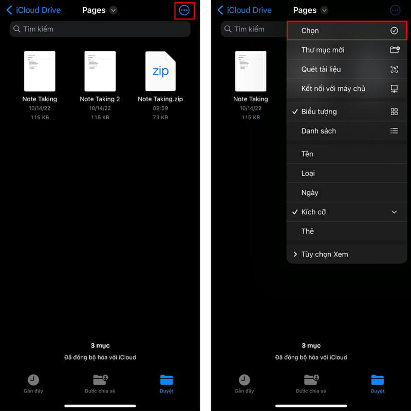Bước 1: Đầu tiên người dùng hãy truy cập vào ứng dụng Tệp > Tìm đến file tệp mình muốn nén lại, tiếp theo nhấn vào biểu tượng ba chấm phía trên góc phải của màn hình > Rồi Nhấn Chọn.