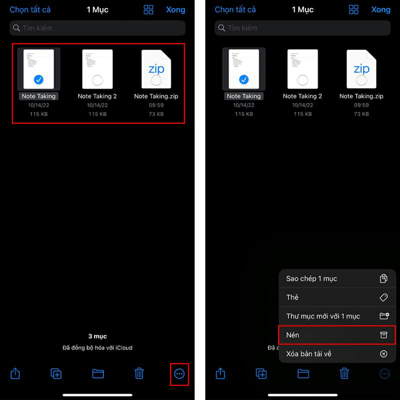 Bước 2: Chọn file người dùng muốn nén > Kích tiếp vào biểu tượng ba chấm ở phía dưới của góc phải màn hình > Chọn Nén vậy là xong.
