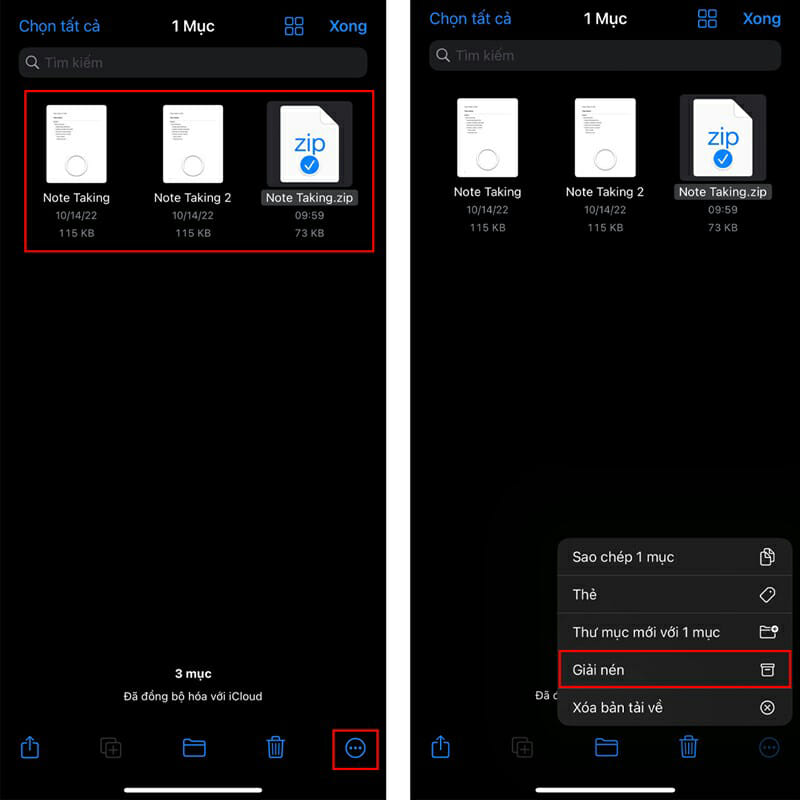 Bước 2: Chọn file người dùng muốn giải nén > Nhấn vào biểu tượng ba chấm ở phía dưới góc phải màn hình > Và Chọn Giải nén.