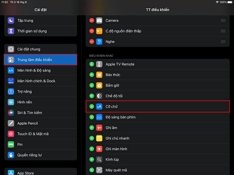 Bước 1: Đầu tiên người dùng truy cập vào cài đặt > Chọn mục Trung tâm điều khiển > Thêm mục Cỡ chữ vào nha.
