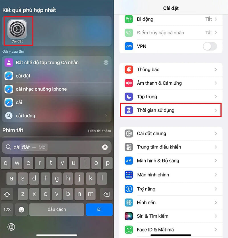 Bước 1: Để tắt thời gian sử dụng trên iPhone, đầu tiên người dùng vào mục Cài đặt ở màn hình chính, sau đó chọn vào Thời gian sử dụng.
