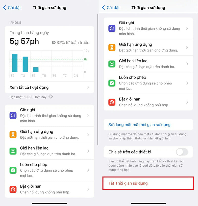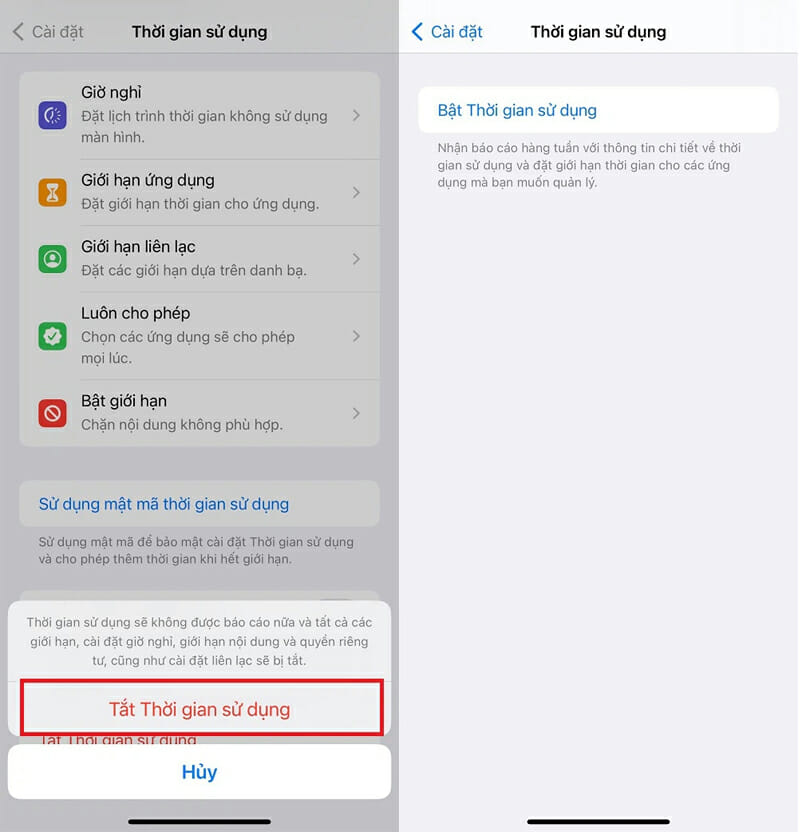 Bước 3: Người dùng hãy chọn vào mục Tắt thời gian sử dụng một lần nữa để xác nhận tắt. Lúc này người dùng đã tắt thành công tính năng này. Để mở lại khi cần sử dụng, chỉ cần vào phần Thời gian sử dụng và chọn Bật thời gian sử dụng là xong.