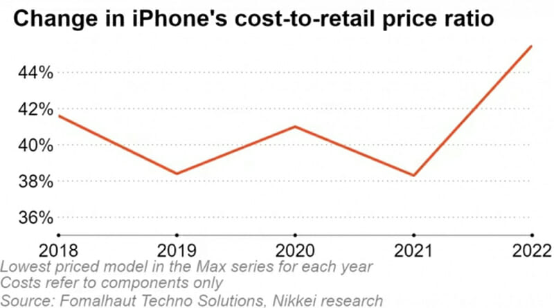 Fomalhaut Techno Solutions – một công ty nghiên cứu có trụ sở tại Tokyo ước tính rằng việc sản xuất mẫu iPhone 14 Pro Max tính theo bộ phận có giá 501 USD – tăng hơn 60 USD so với mẫu iPhone 13 Pro Max. Trong khi giá linh kiện cho các mẫu Max cao cấp dao động trong khoảng từ 400 USD đến 450 USD kể từ khi chúng được ra mắt vào năm 2018, thì chi phí cho mẫu mới nhất đã tăng mạnh hơn 60 USD. Do đó, chi phí của mẫu iPhone Pro 14 Max là cao nhất cả về tổng số và biên độ tăng kể từ năm 2018.