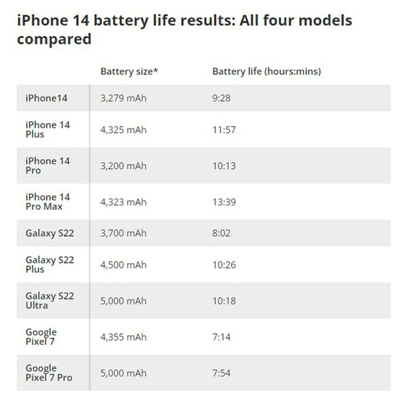 Cuối cùng là iPhone 14 Pro Max, thiết bị này một lần nữa chứng tỏ khả năng “vô địch” về thời lượng pin. Với viên pin 4.323mAh đã giúp kéo dài thời gian sử dụng lên tới 13 giờ 39 phút, vượt xa thời gian 10 giờ 8 phút của mẫu Galaxy S22 Ultra.
