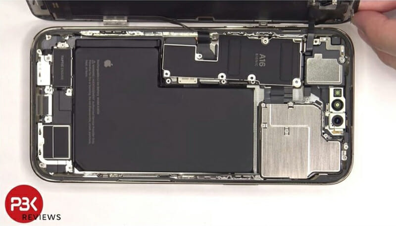Sau khi mở ốc dưới chân máy và tháo màn hình bằng cách gỡ lớp keo thì các linh kiện bên trong máy bắt đầu hiện ra. Mẫu iPhone 14 Pro Max có cách sắp xếp giống như những thế hệ trước. Điểm khác biệt rõ ràng nhất đó chính là viên pin chữ L rất lớn cùng với bảng mạch bên trái có chữ “A16 Bionic”.