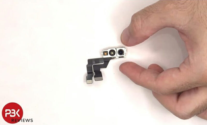 Bên cạnh đó, việc tháo rời khu vực camera của máy khá phức tạp đòi hỏi sự chuyên nghiệp. Sau khi “mổ bụng” chúng ta nhận ra 1 điều là Apple đã đưa cảm biến tiệm cận xuống dưới màn hình nên phần notch chỉ có camera TrueDepth cùng cới cảm biến Face ID. Qua đó cho thấy diện tích phần notch của máy cũng nhỏ hơn 30% so với thế hệ tiền nhiệm.