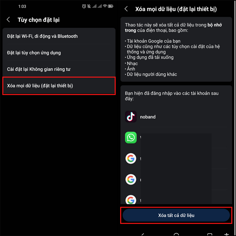 Bước 2: Tiếp theo chọn vào Xóa mọi dữ liệu (đặt lại thiết bị) > Xóa tất cả dữ liệu.