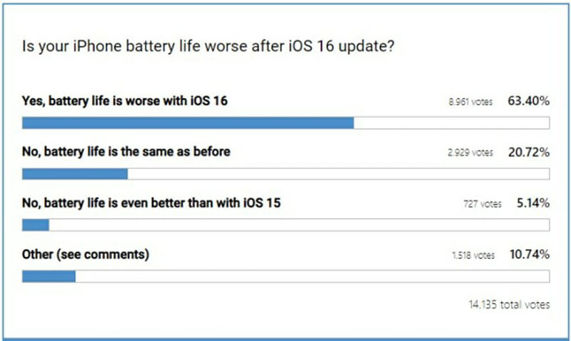 Theo một cuộc khảo sát của 9to5Mac, 63% người dùng iPhone cho biết tuổi thọ pin của họ kém hơn sau khi cài đặt bản cập nhật iOS 16. Thậm chí nó còn xảy ra trên những mẫu iPhone mới như dòng 13 Series hoặc là iPhone 12 Series. Tuy nhiên hiện tại, Apple vẫn chưa lên tiếng về vấn đề bản iOS 16 ảnh hưởng đến tuổi thọ pin iPhone.