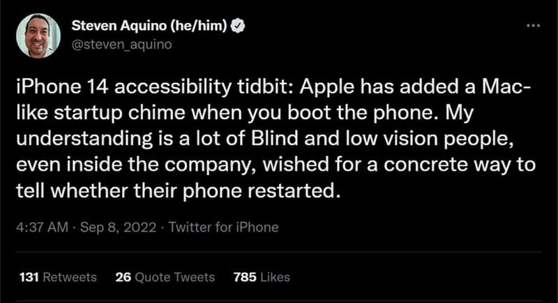 Có thể Apple sẽ cập nhật thêm tính năng mới để hỗ trợ cho những người khiếm thị bằng cách cho phép iPhone 14 series phát ra âm thanh khi khởi động. Mới đây một chuyên gia công nghệ có tên là Steven Aquino đã so sánh tính năng này với tiếng chuông mang tính biểu tượng của máy Mac.