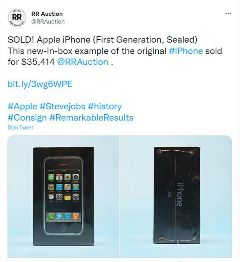 Mới đây một cuộc đấu giá “Apple, Jobs và Computer Hardware” đã được tổ chức gần đây tại RR Auction đã chứng kiến một chiếc iPhone đời đầu còn nằm trong hộp, chưa bóc tem được bán với mức giá cao đến bật ngửa 35.414 USD (~ 830 triệu VND). Con số này gấp 70 lần so với giá gốc của điện thoại là 499 USD (~ 11.7 triệu VND).