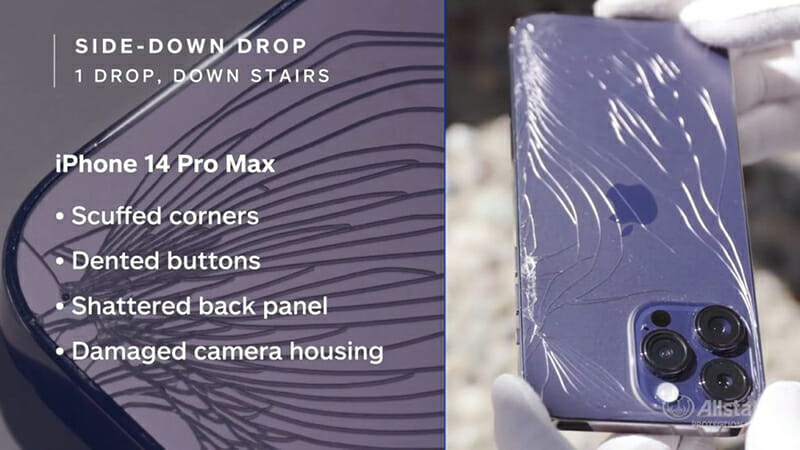 Khi bị rơi nghiêng xuống một dãy cầu thang lát đá, mẫu iPhone 14 Plus bị hư hại tối thiểu – chỉ có một vài vết xước ở các góc. Còn mẫu iPhone 14 Pro Max có mặt sau bị nứt, các góc bị xước, các phím bấm của máy cũng bị móp, vỏ máy bị hư hỏng. Allstate Protection Plans lưu ý rằng mỗi sản phẩm vẫn hoạt động bình thường mặc dù bị hư hỏng.