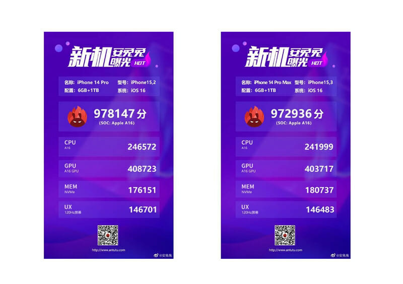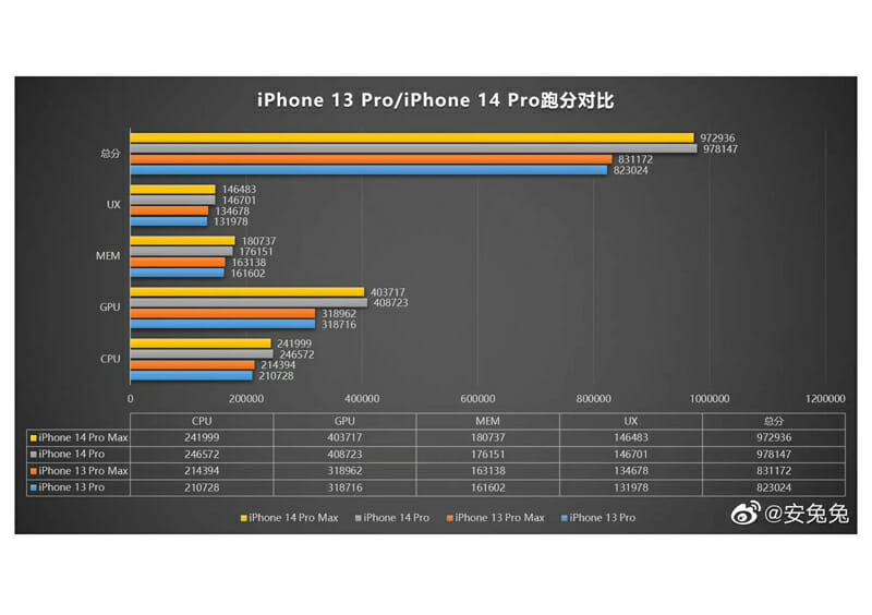 Chiếc iPhone 14 Pro có tổng điểm là 978.147 điểm và mẫu iPhone 14 Pro Max có tổng điểm là 972.936. Có thể thấy nó đã được cải thiện gần 18,8% so với bộ đôi iPhone 13 Pro cao cấp. Hiệu suất CPU cũng đã được cải thiện gần 17%. Trong khi đó GPU tăng 28% so với thế hệ trước. Đây cũng là một kết quả ấn tượng nhưng không nằm ngoài dự đoán của người dùng.