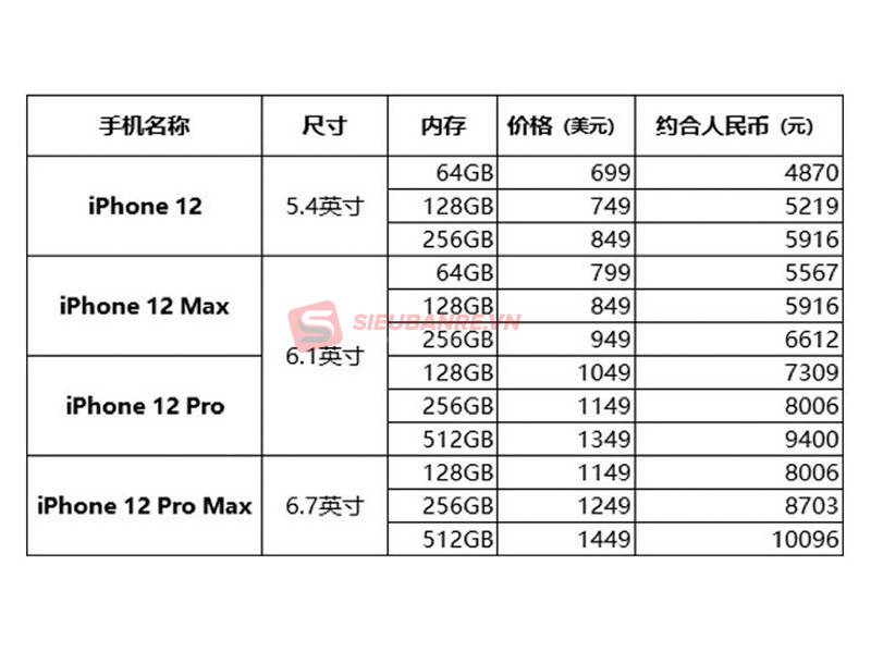 Do tấm ảnh này được ghi bằng tiếng Trung nên phải dùng công cụ để hỗ trợ và ở đây có 2 cột cho các mức giá và chúng ta chỉ cần cột giá bán $ (bên phải là CNY) nên thế hệ iPhone 12 sẽ có mức giá bán lẻ đề nghị như sau và so sánh cùng với dòng iPhone 11 | 11 Pro | 11 Pro Max ra mắt năm 2019: