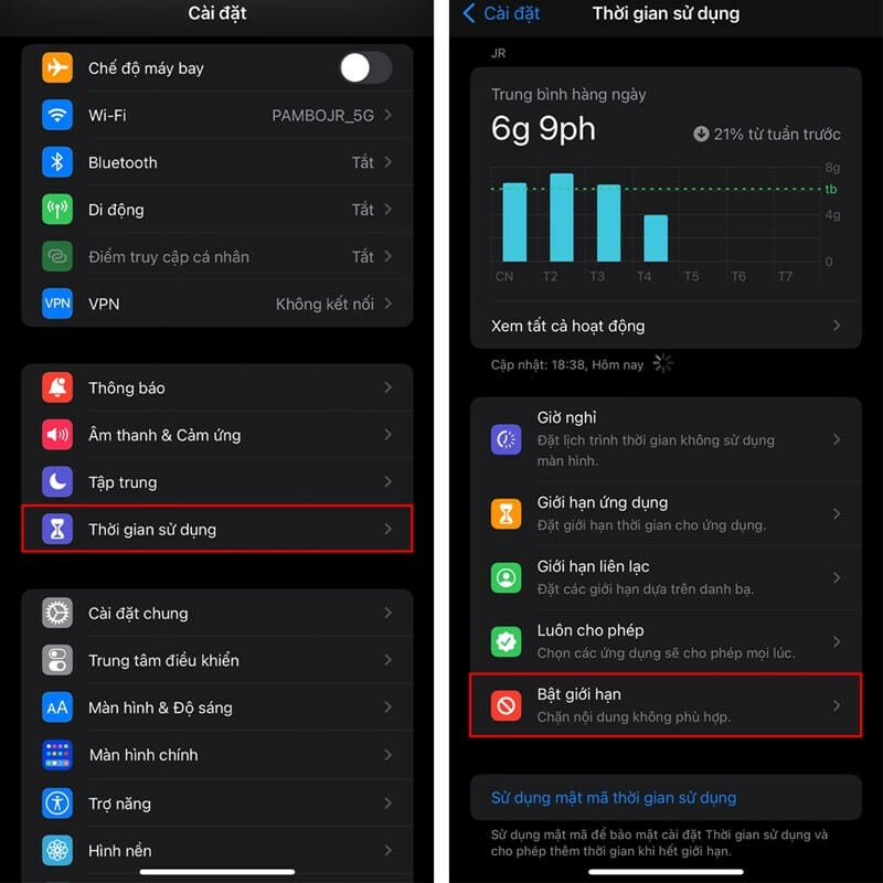 Bước 1: Đầu tiên người dùng truy cập vào Cài đặt của máy > Chọn đến mục Thời gian sử dụng > Lúc này người dùng nhấn chọn tiếp vào Bật giới hạn.