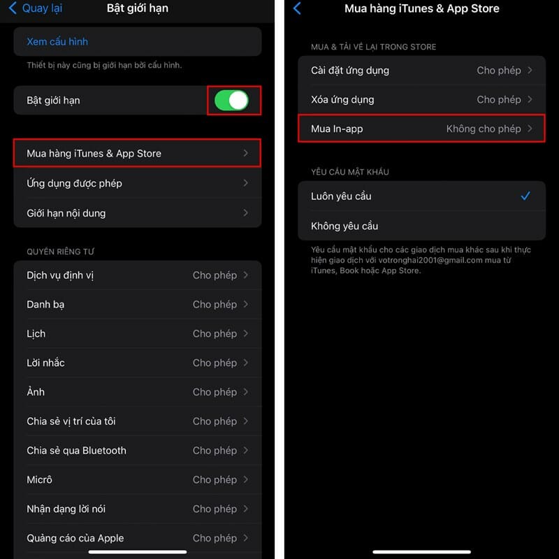 Bước 2: Sau đó bật giới hạn lên > Tìm và chọn vào Mua hàng iTunes & App Store > Tiếp theo nhấn chọn vào Mua In-app.