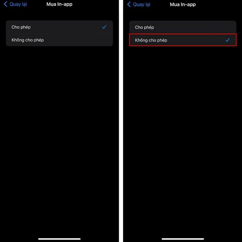 Bước 3: Tại đây người dùng hãy tích chọn vào Không cho phép. Khi đã thực hiện kích hoạt không cho phép thì mỗi khi người dùng thanh toán dịch vụ trong ứng dụng nào đó, sẽ có thông báo Không cho phép sử dụng In-app xuất hiện, để thanh toán được thì người dùng phải vào lại Mua In-app và tích chọn vào Cho phép mới được. Tuy cực một tí nhưng sẽ giúp cho người dùng tránh bị thanh toán nhầm trong khi sử dụng ứng dụng.