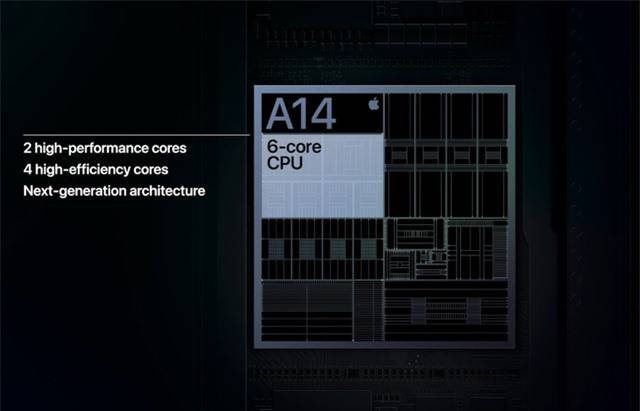 Tất cả 4 mẫu iPhone 12 2020 mới của Apple đều được trang bị chipset A14 Bionic, con chip đã có mặt trên iPad Air 4. Đây là chip 5nm đầu tiên có mặt trên smartphone với 15 tỷ bóng bán dẫn bên trong (so với 8,5 tỷ bóng bán dẫn trong A13 Bionic), A14 Bionic mang lại hiệu năng không quá cao nhưng lại cải thiện mức tiêu thụ điện năng.